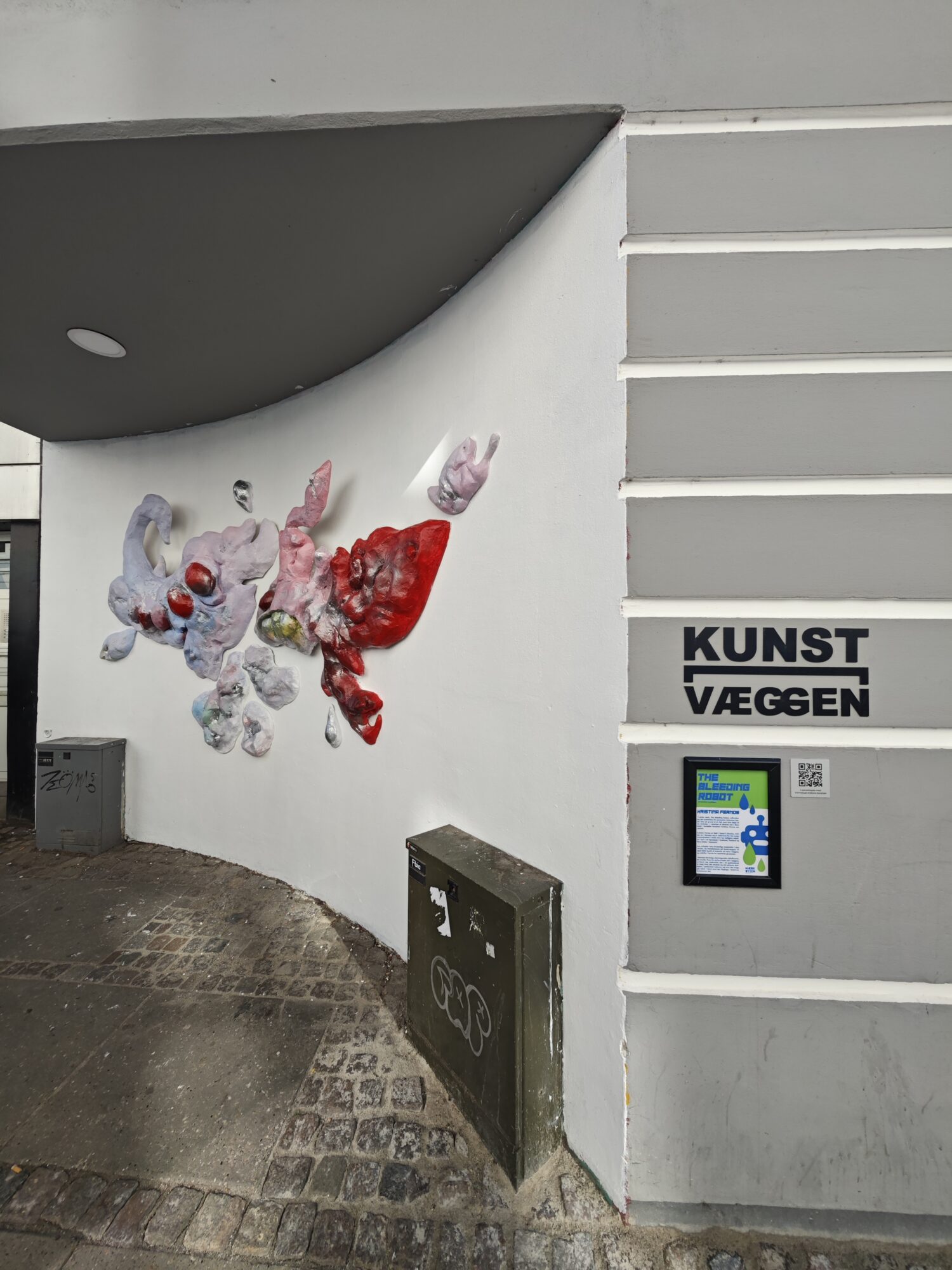 Det kan lyde paradoksalt med en blødende robot, men ikke desto mindre er det titlen på værket af den herboende ukrainske kunstner Kristina Fernos, der fra september 2025 pryder Kunstvæggen i Borgergade.